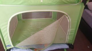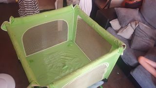Parque infantil en buen estado, ideal para que los más pequeños jueguen y descansen de forma segura. - Estructura resistente y segura. - Laterales de malla para ventilación. - Incluye una colchoneta de juegos. Se incluye funda de viaje y colchón. Como desperfecto tiene un pequeño agujero en la malla de un lateral.