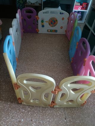 Parque infantil de plástico resistente, ideal para que los más pequeños jueguen de forma segura. - Paneles de colores: amarillo, azul, blanco, rosa, morado, verde. - Incluye panel de actividades con ruedas y figuras. - Fácil de montar y desmontar.