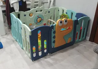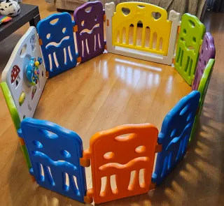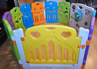 Parque infantil de plástico, colorido y en buen estado. Ideal para que los más pequeños jueguen con seguridad. - Fácil de montar y desmontar. - Paneles de plástico resistente. - Diseño colorido y atractivo. - Incluye 14 paneles. Se vende sin juguetes y sin CAJA