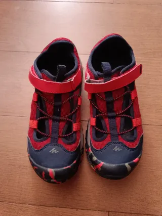 Zapatillas de montaña / trekking para niño en talla 34/35. Perfectas para aventuras al aire libre o no pasar calor en el parque. Marca Quechua de decathlon - Cierre con cordones elásticos y velcro. - Diseño en color rojo llama y azul marino acero. - Suela con buen agarre.
