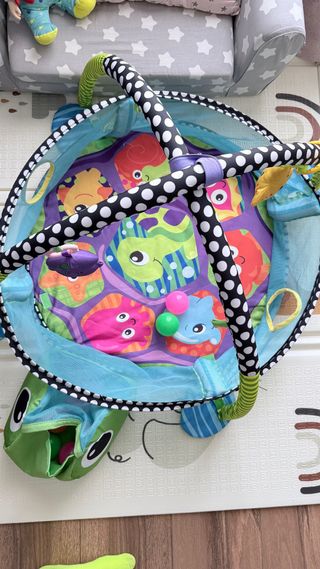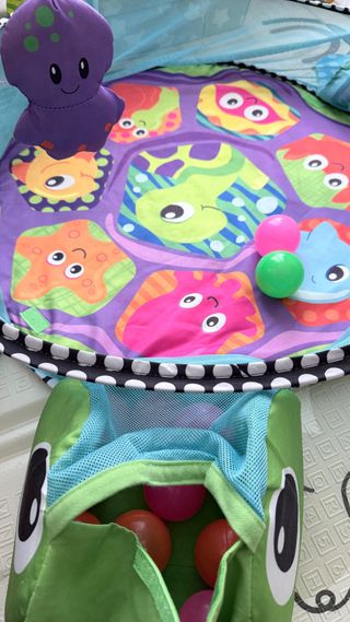 Parque de juegos para bebés con diseño de tortuga. - Incluye una bolsa de malla para guardar pelotas con pelotas - Colchoneta con dibujos de criaturas marinas. - Estructura con arcos para colgar juguetes. Se pliega y se queda guardada en una bolsita