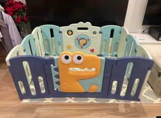 Parque infantil de plástico con diseño de dinosaurio. - Paneles de colores en tonos azules. - Figura de dinosaurio naranja con ojos grandes. - Incluye elementos interactivos en uno de los paneles. - Ideal para dejar al niño de forma segura mientras puedes hacer las tareas de la casa.