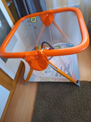 cuna de viaje o parque de juegos es muy practica ya que la puedes mover a la estancia que desees tienes patas para meserlo o tambien para que se quede estable tiene algunos rayajos pero esta muy bien se arma y se desarma muy facil, de todas maneras lo puedes ver sin compromiso