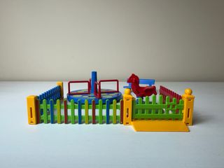 Mini parque infantil de juguete montado a partir de piezas originales de varios sets. Incluye un carrusel azul, un caballito rojo con muelle, un banco azul y vallas de distintos colores con entrada. Ideal para ampliar ciudades, escenas o maquetas. Todas las piezas están en perfecto estado y encajan perfectamente entre sí. Perfecto para niños, coleccionistas o para completar sets incompletos.