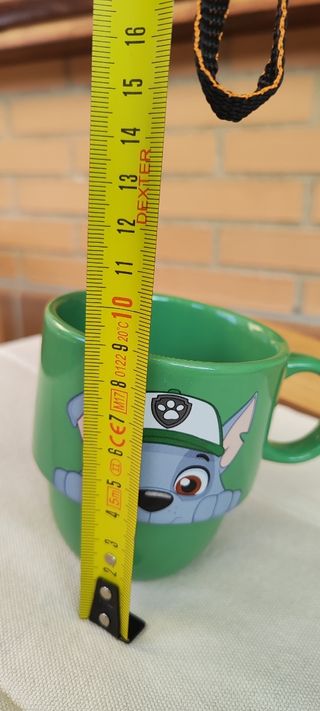 Taza verde con el personaje Rocky de la Patrulla Canina. Es de cerámica. - Diseño infantil. - Ideal para los fans de la serie. Comprada en el parque de atracciones. Fueron unos modelos exclusivos que sacaron. No tiene mucho uso y está en perfecto estado. Mi hijo ya ha crecido y no la usa.