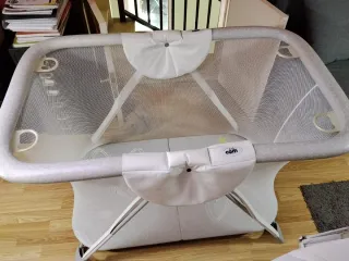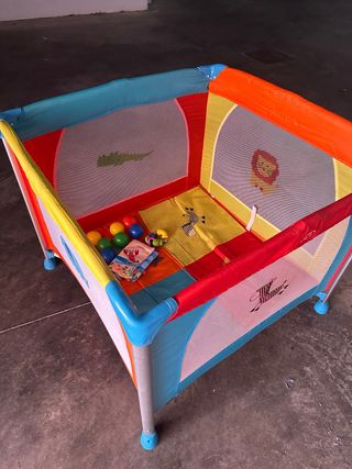 Parque infantil plegable con MUY POCO USO. Es súper práctico y versátil, muy compacto para trasladar (lleva un asa). Lo puedes montar y desmontar fácilmente en menos de un minuto. Funciona bien en interiores y exteriores. Pesa solo 4 kilos y plegado cabe en cualquier parte. La malla del tejido es súper resistente. Tenemos unos amigos que tienen uno igual y lo utilizan con su mascota, porque es muy resistente.