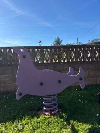 Balancín de muelle robusto, ideal para parques públicos o jardines. Su diseño en forma de foca morada lo hace atractivo para los más pequeños. - Estructura resistente y duradera. - Muelle de gran tamaño para un balanceo seguro.