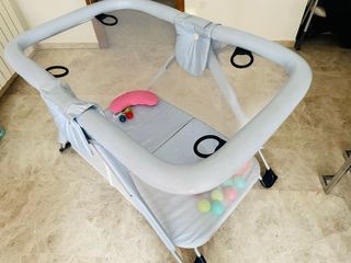 doble uso: cuna de viaje aunque de medidas no es la típica es rectangular, sinó que tira más a cuadrada que la hace ideal como parque infantil que es básicamente el uso que yo le dí. Con 4 juguetes, el niño estaba dentro entretenido y controlado. Una perfecta inversión para tener el bebé controlado y poder bajar la guardia un rato. Colores: rojo, azul, verde y amarillo. Muy chula. Por su peso y dimensiones no se envía. Precio ajustado por lo que no hago regateos. Te regalo la silla de bañera (una de las 4 ventosas no pega mucho pero es peefectamente funcional, perfecta tambien para poderlo bañar comodamente).