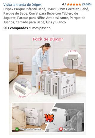 Parque infantil y corralito para bebés de la marca Dripex. Ideal para crear un espacio seguro y divertido. - Dimensiones exteriores: 150x150cm. - Altura: 62cm. - Incluye tablero de juguete. - Diseño antideslizante. - Color: Gris y Blanco. - Esta sin uso fue un regalo y nunca lo hemos usado.