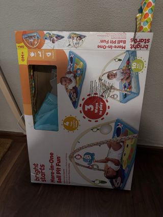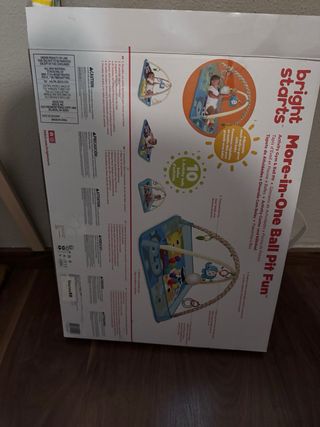 Parque infantil acolchado con arcos y juguetes colgantes en perfecto estado