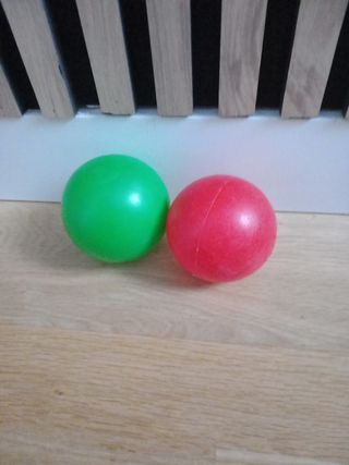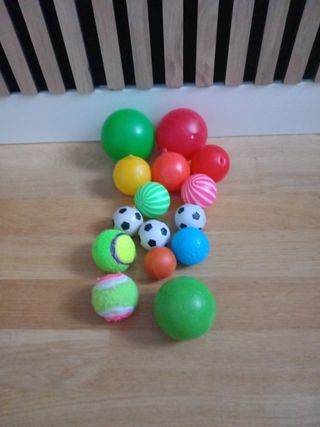 15 pelotitas: las dos más grandes verde y roja son como las de los parques de bolas las tres siguientes amarilla naranja y roja tienen para colgar las dos de rayas son como pelotas de ping pong pero más grandes las tres de fútbol son como las de rehabilitación pero pequeñitas las dos de tenis son como las de tenis pero más pequeñas y la verde es como las de rehabilitación de mano Se puede entregar en Alcorcón Villaviciosa, Brunete, Navalcarnero, Xanadu o Sevilla La Nueva, o en la parada de tren San Fernando