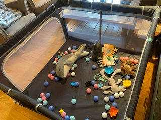 Parque infantil seguro y espacioso para que los más pequeños jueguen. - Estructura de tela y tubos de plástico. - Puerta con cremallera. - Incluye una bolsa de almacenamiento. - Incluye aros para colgar juguetes. - incluye 25 bolitas tiene algunas pequeñas manchitas como se ve en las fotos.