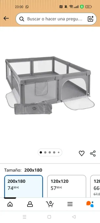 Parque infantil Oxford XL, ideal para que los más pequeños jueguen de forma segura. Dimensiones del producto: largo x ancho x alto 120 x 120 x 64 centímetros - Estructura de tela Oxford. - Laterales de malla transpirable. - Dos asas de seguridad para ayudar a levantarse de regalo Nota de 4,7 en amazon de 2.450 opiniones. Precio actual 93€