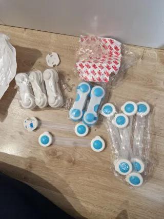Pack de seguridad para el hogar, ideal para proteger a los más pequeños de posibles accidentes en armarios y cajones. Incluye varios cierres y protectores. - Cierres de seguridad adhesivos. - Protectores de esquinas. - Adhesivos 3M de alta resistencia. Faltan algunas piezas, por eso el precio reducido