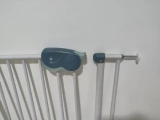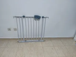 Se trata de una barrera de seguridad de madera, también conocida como barrera para bebés o mascotas. Diseñada para evitar que niños pequeños o mascotas accedan a determinadas zonas de la casa, como escaleras o puertas. Construida con barrotes de madera natural y herrajes de plástico blanco. Cuenta con un sistema de ajuste a presión o con tornillos, lo que permite una instalación versátil sin necesidad de taladrar. Suele ser extensible para adaptarse a diferentes anchos de puertas o pasillos