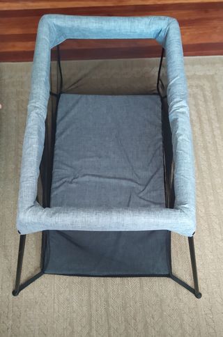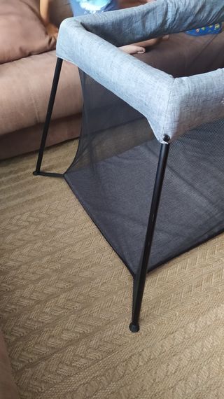 Cuna viaje tipo parque, marca Kindsgut. Marca alemana. Buena cuna. Sólida. Sistema antivuelcos. El colchón se apoya en el suelo, no está flotante. Es cómodo, tiene un grosor y solidez adecuado. Muy fácil de montar y desmontar. Ligera. 5 kg. Pequeñas dimensiones. El colchón mide 60x100cm. Para bebés. PERFECTA PARA VIAJES. Montada mide (distancia entre las patas abiertas): 117x88cm.x85cm. Recogida, el maletín, mide: 48x60cm. Está como nueva.