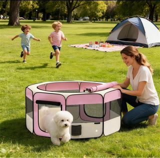 Parque plegable para mascotas, ideal para exteriores. Fácil de montar y desmontar. - Diseño hexagonal. - Materiales resistentes y transpirables. - Color rosa y beige. Ref: d06-288v01pk