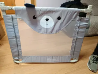 Barandilla de seguridad para cama de bebé con un simpático diseño de oso. Mide 0.9 metros de largo. - Diseño frontal con cara de oso y orejas. - Color gris claro con detalles en azul. - Estructura de metal y tela. Tengo también una de 1'8 y otra de 2 m Se venden juntas o por separado. El precio es individual