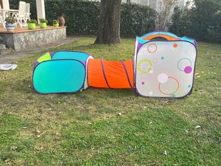 Parque infantil de tela y malla. - Medidas 120*120 cm - Estructura interior de acero - Incluye alfombra de juegos con diseño infantil - Puerta de acceso con cremallera Puedes llevártelo sin desmontar, es muy ligera. La vendemos porque ya no la usa.