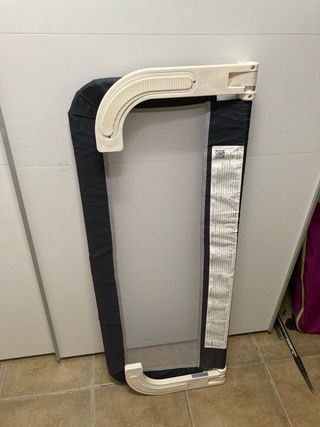 Barrera de seguridad para cama de 90cm. Abatible. Diseñada para evitar caídas. Yo, por el tamaño, la coloqué a los pies de la cama. - Estructura de tela con estampado de estrellas grises. La tela de rejilla permite ver al bebé/niño en todo momento - Marco de soporte blanco. La vendo con instrucciones y todos los accesorios. Nueva cuesta 32€ Marca: Interbaby