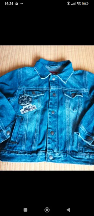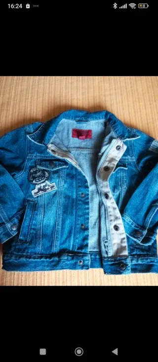 Cazadora vaquera para niños de 4 a 5 años. Tiene un diseño clásico con parches. Está nueva, usada un par de veces, - Cierre de corchetes y cremallera - Bolsillos. - Cuello camisero.