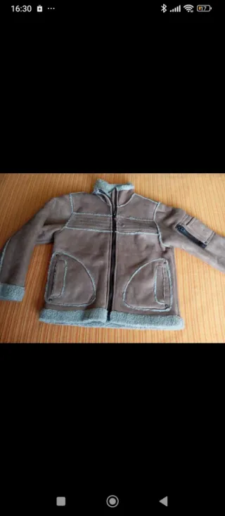 Cazadora de ante para niño/a de 7 años, con forro interior de borreguito. Como se puede ver en las fotos en la parte trasera tiene una pequeña marca(oscuro) inapreciable. - Color marrón. - Cierre de cremallera. - Bolsillos delanteros. - Detalle de pespuntes.