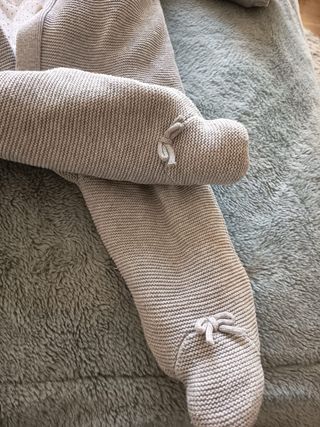 Conjunto de ropa de punto para bebé, ideal para la primera puesta. Prendas suaves y cómodas. - Variedad de prendas tejidas. - Diseños delicados. - Tonos neutros y pasteles. - Incluye 3 conjuntos recién nacido y 1 de 3 meses gris. - 6 jerseys + 1 body