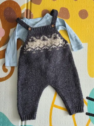 Conjunto calentito de tres prendas para bebé, marca Zara, ideal para edad entre los 3 y 6 meses. - Jersey de punto gris con diseño nórdico y botones de madera. - Peto de punto gris con diseño nórdico y botones de madera. - Body cruzado azul claro con estampado de cebra. Ropa ideal para invierno.