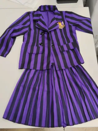 Conjunto de uniforme escolar inspirado en Miércoles Addams. Incluye chaqueta y falda plisada. - Chaqueta a rayas moradas y negras con escudo. - Falda plisada a juego.