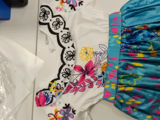 Disfraz inspirado en el personaje Maribel de la película Encanto. Incluye vestido y bolso. - Vestido blanco con mangas cortas y cuello adornado. - Falda larga con estampado colorido y detalles. - Bolso marrón a juego con estampado y lazo rosa.