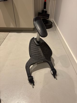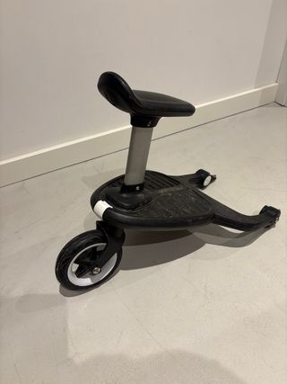 Accesorio para cochecito Bugaboo que permite a un niño mayor viajar de pie. - Plataforma negra con superficie antideslizante. - Rueda única para facilitar el movimiento. - Asiento integrado. - Conexiones ajustables para el cochecito. Practicamente sin uso. En perfectas condiciones.
