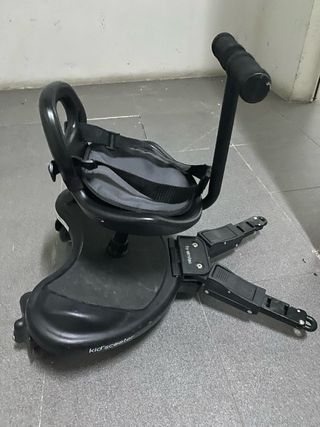Accesorio para cochecito Bugaboo, permite que un niño mayor viaje de pie. - Plataforma negra con asiento. - Ruedas para facilitar el movimiento.