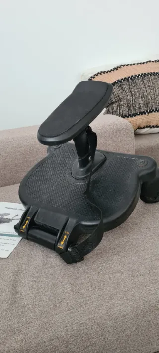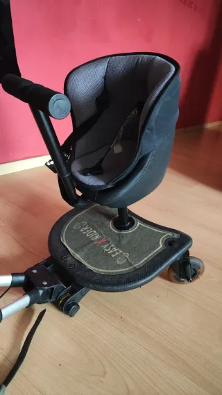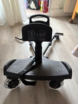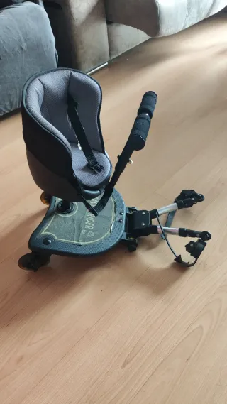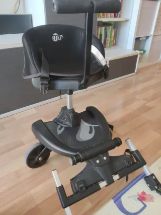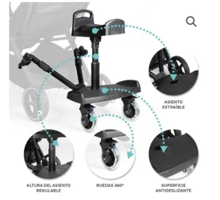 Accesorio para cochecito de bebé que permite que un niño mayor viaje de pie. - Asiento acolchado. - Arnés de seguridad. - Ruedas para facilitar el movimiento.
