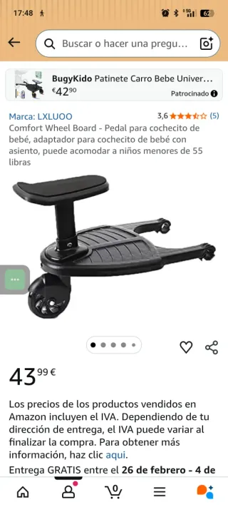 Accesorio universal para cochecito de bebé, que combina asiento y patinete. El patinete para el hermano mayor. Fue un regalo y está por estrenar (en su caja). Tiene garantía de 3 años desde dic/2025 - +24m -Hasta 5 años o 25 kg. - 44 x 62/22 x 59 cm. - 3’20 kg. – 4’40 kg. (con asiento) - Permite transportar su hijo cómodamente y sin que se canse en el cochecito - Plataforma con superficie antideslizante - El niño puede ir sentado o de pié - Asiento acolchado y extraíble - Correa ajustable para guardar la plataforma - Ruedas blandas