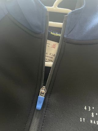 Sudadera efecto neopreno, con cierre frontal con cremallera y capucha, 140 cm, talla 10 de Zara Kids, color negro y azul marino, bolsillos con cremallera. El tejido efecto neopreno ligero, cómodo y suave, esta en perfecto estado, a mi hijo se le quedo pequeño y apenas lo pudo usar.
