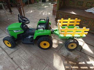 Tractor eléctrico con mando para los papas, música por bluetooth. Funciona perfectamente . Solo tiene las pegatinas un poco gastadas por el uso