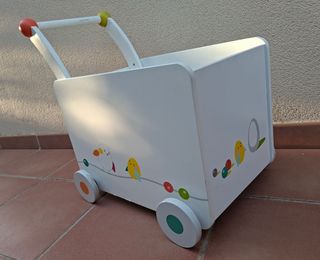 Preciosa carretilla de madera para niños, ideal para guardar juguetes o transportarlos. Está en muy buen estado y es perfecta para que los más pequeños se diviertan. Vertbaudet. - Carrito de madera blanco con pájaros pintados. - Ruedas de colores. - Asa de madera para facilitar su manejo. - Contiene un ábaco de bolas de colores.