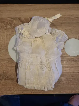 Conjunto de Cristianar, para bautismo de bebé, ideal para ceremonias especiales. Incluye un trajecito, un delicado gorrito a juego y bajo vestido. - Tejido crema con detalles de encaje y lazos en los hombros. - Adornado con puntillas y plisados. - Botonadura a la espalda. - Gorrito con detalle de flores en los laterales, con cintas para atar. TIENE mas de 60 años, nos bautizamos todos los hermanos y sobrinos con él. Está bien cuidado y conservado.