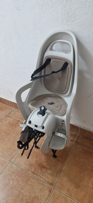 Silla de seguridad para bicicleta marca Polisport, modelo Move. - Color blanco y beige. - Incluye arnés de seguridad. - Reposapiés ajustables.