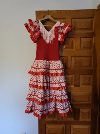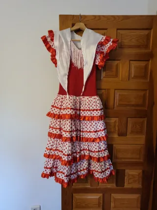 Vestido de sevillana para niña de 7 años. Ideal para fiestas y eventos. - Cuerpo rojo. - Falda blanca con lunares rojos y volantes. - Adorno blanco en el cuello con flecos.