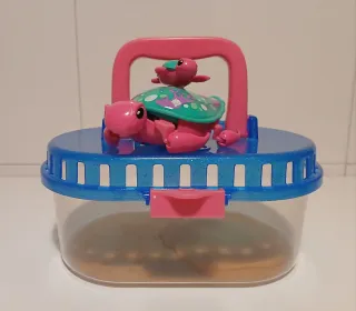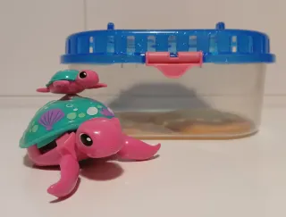 Tortuga Little Live Pets con bebé y acuario. La tortuga bebé se pega al caparazón de su madre para nadar con ella. Llena el tanque de agua y verás cómo nada sin parar. Si la pones en el suelo camina como una tortuga de verdad. Pilas incluidas. En perfecto estado.