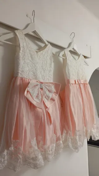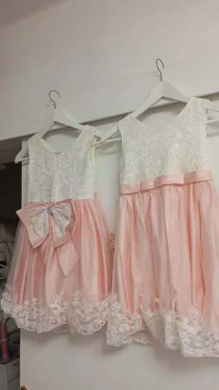 Conjunto de dos vestidos para niña, ideales para ocasiones especiales. - Parte superior de encaje blanco. - Falda de tul y satén en color rosa pálido. - Detalle de lazo grande en la cintura del vestido izquierdo. - Adorno de encaje en el bajo de ambos vestidos. Tengo 2 vestidos iguales. Cada uno Individual 12 euros
