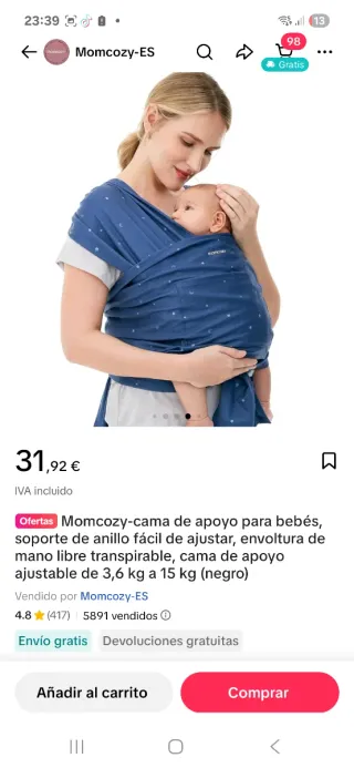 Portabebés Momcozy en color negro, ideal para llevar a tu bebé de forma cómoda y segura. Diseñado para manos libres y con un tejido transpirable. - Soporte de anillo fácil de ajustar. - Adecuado para bebés de 3,6 kg a 15 kg. - Vendido por Momcozy-ES. - Envío gratis.