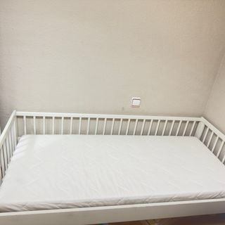 Cuna de madera de IKEA para bebé. Su diseño sencillo se adapta a cualquier estilo. - Fabricada en madera clara. - Adaptada para funcionar cómo cuna colecho - Incluye colchón, funda y ropa de cama