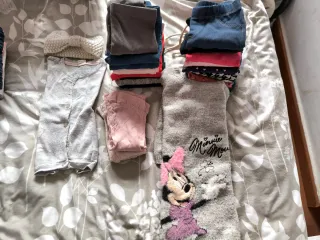 Lote de ropa para niña de 12 a 18 meses. Incluye varias prendas. Alguna puede ser de 18-24m. - vestido de Minnie Mouse, talla 18-24 - Chaqueta fina gris. - 16 Pantalones tejanos y leggins - 3 medias finas, rositas 12-18
