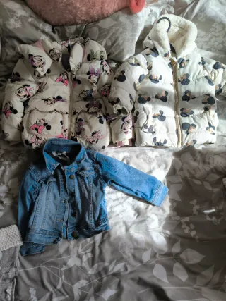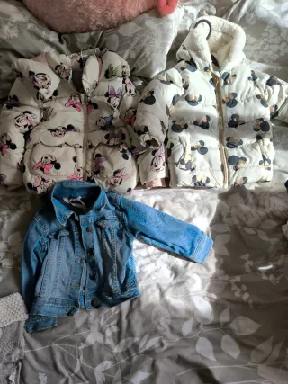 Conjunto de dos chaquetas infantiles con estampado de Minnie Mouse. - Chaqueta acolchada blanca y negra talla 86 - Chaqueta acolchada blanca con siluetas de Minnie de colores talla 92 - Chaqueta vaquera azul talla 92