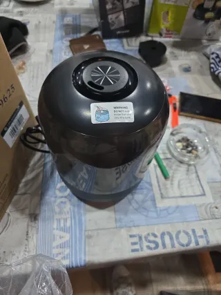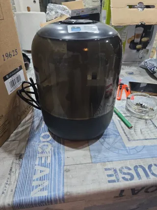 Humidificador de diseño moderno, ideal para habitaciones infantiles. Su forma redondeada y acabado oscuro lo hacen un complemento discreto. - Depósito de agua translúcido. - Base de color oscuro.