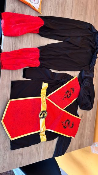 Disfraz de ninja para niños de 10 a 12 años. - Incluye traje completo. - Diseño con dragones y detalles dorados. - Mangas y pantalones negros con detalles rojos. Esta nuevo, se compro taya equivocada y al quitar la etiqueta no lo puedo devolver.