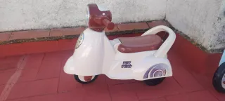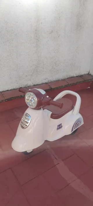 Moto de juguete estilo scooter, ideal para los más pequeños. Su diseño es llamativo y divertido. - Color blanco y detalles en granate. - Ruedas resistentes para jugar en interiores y exteriores. - Asiento cómodo para el conductor.