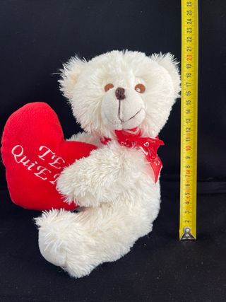 Adorable osito de peluche blanco con un corazón rojo. - El corazón tiene bordado TE QUIERO. - Lleva un lazo rojo en el cuello. - 14 x 18 cm